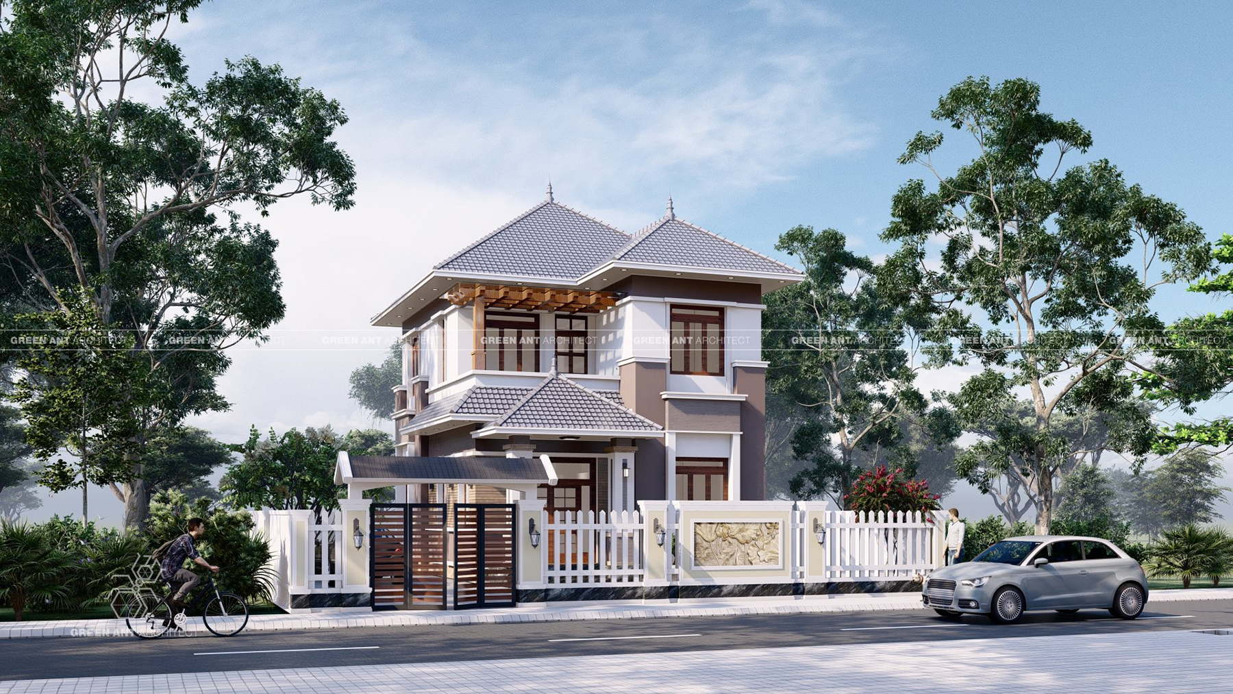 | Loại kiến trúc : Biệt thự vườn | Công năng : Tầng 1: Phòng khách, Phòng bếp, Phòng ăn. Tầng 2: 3 Phòng ngủ |